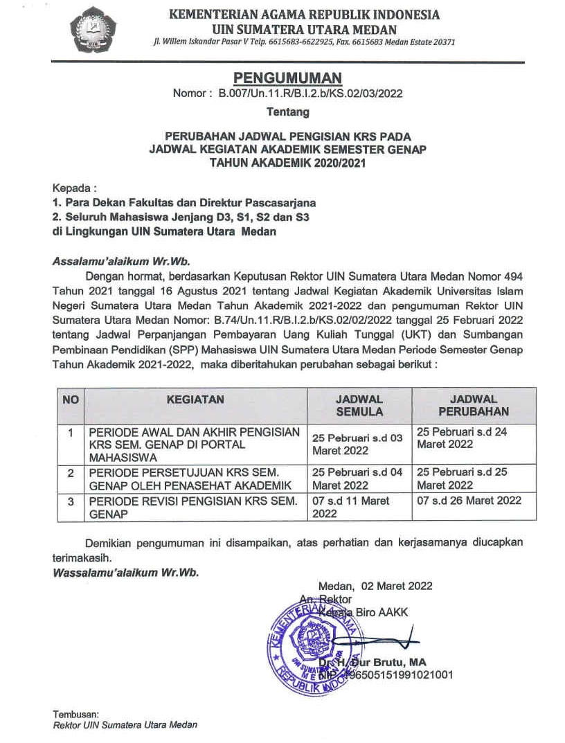 Sabtu, 5 Maret 2022, berita | Dilihat : 1.496 kaliBerdasarkan Keputusan Rektor UIN Sumatera Utara Medan Nomor 494 Tahun 2021 tanggal 16 Agustus 2021 tentang Jadwal Kegiatan Akademik Universitas Islam Negeri Sumatera Utara Medan Tahun Akademik 2021-2022 dan pengumuman Rektor UIN Sumatera Utara Medan Nomor: B.74/Un.11.R/B.I.2.b/KS.02/02/2022 tanggal 25 Februari 2022 tentang Jadwal Perpanjangan Pembayaran Uang Kuliah Tunggal (UKT) dan Sumbangan Pembinaan Pendidikan (SPP) Mahasiswa UIN Sumatera Utara Medan Periode Semester Genap Tahun Akademik 2021-2022.